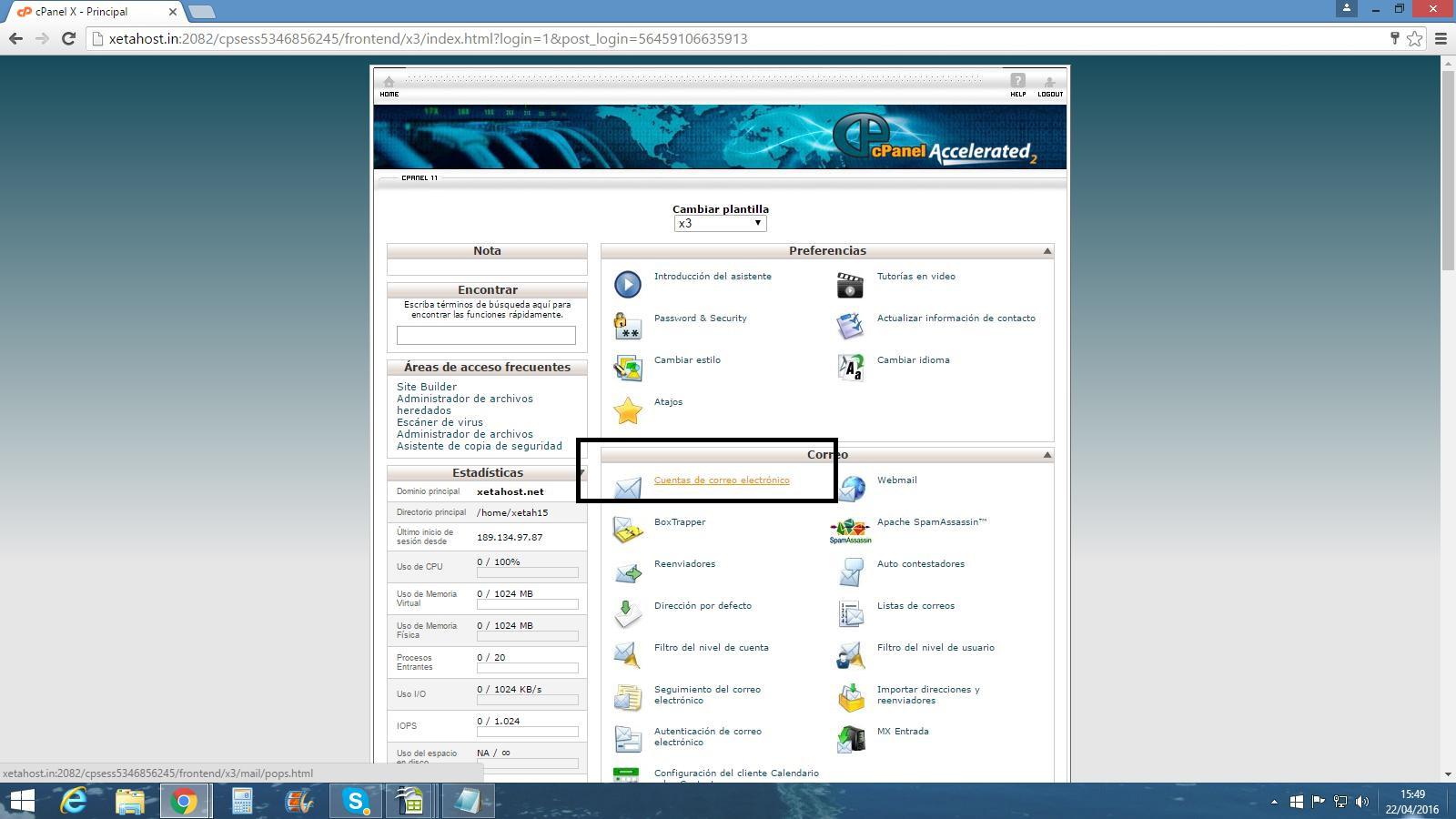 2.- Una vez dentro buscaremos el apartado de correo y seleccionaremos “Cuentas de correo”