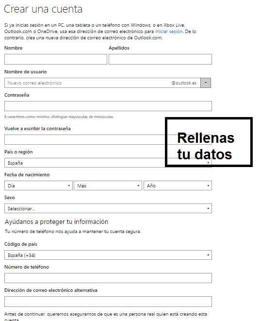 3)Rellenar datos de registro de hotmail , sin dejar ninguno vacio ( recuerda el nombre usuario y extension que escogeras la igual que tu contraseña , para que puedas entrar proximamente)