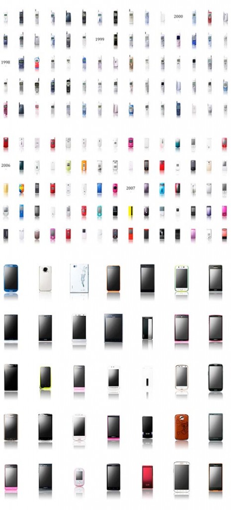 Se ve claramente como pasamos de tener grandes ladrillos con una antena y pequeñas pantallas monocromáticas a celulares más livianos, con mejores colores, pantallas táctiles de la década pasada y finalmente a los nuevos Smartphones que son solo una pantalla táctil.