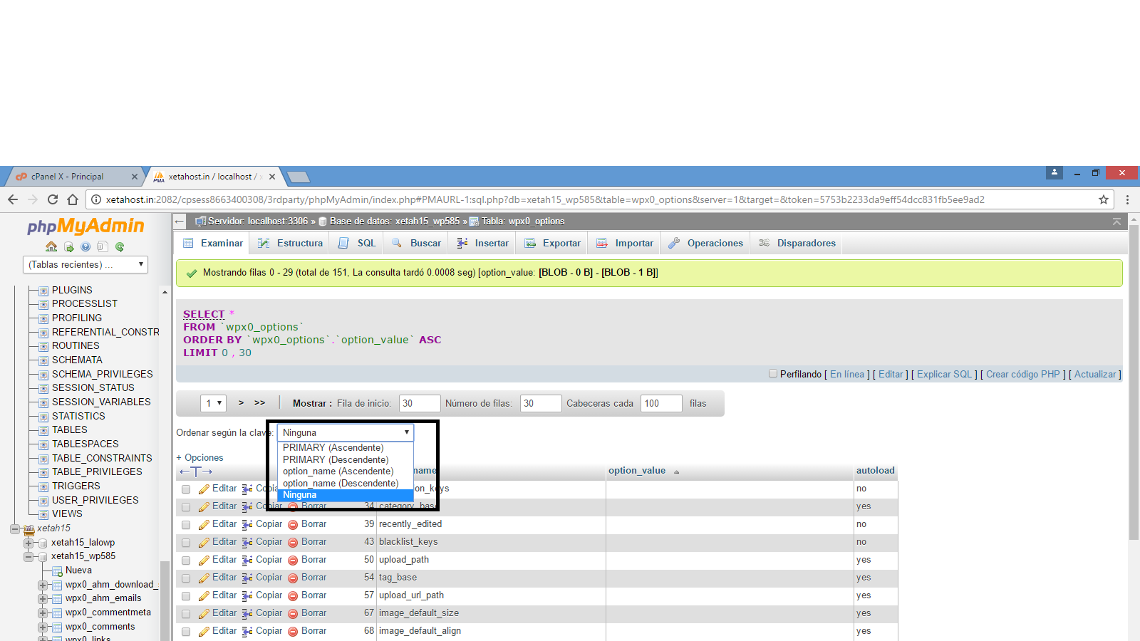 Una vez seleccionada la opción daremos clic en opcions_value y se desactivaran todos los plugins, si ya puedes entrar a WordPress es que error en un plugin, ahora hay que ir activando uno por uno para ver cual es el que esta dando error.